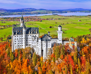 Замок Нойшванштайн величаво возвышается на высоком склоне, поросшем тёмно-зелёными елями в красивейшем уголке Баварских Альп Германии. С немецкого название замка переводится как «Новый лебединый утес». Это еще один каприз короля Людвига II, который в 1837 году построил замок-дворец для своего любимого композитора Вагнера. Высота этого сказочного сооружения - 90 метров.
